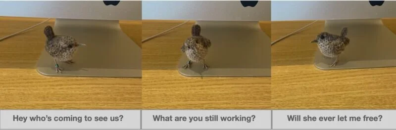 My sis bought me this sweet little knitted wren which sits on my computer. He usually faces the door (left pic) and I feel he is looking with interest to see who is coming to see us. Sometimes he gets knocked to the middle and seems to be looking at me with a critical eye. The last one I hate because he looks like a sad little caged bird looking out of the window wondering when he will be freed. I turn him back immediately to the cheery one where he and I are looking with anticipation at what's happening in the house. Sad I know!